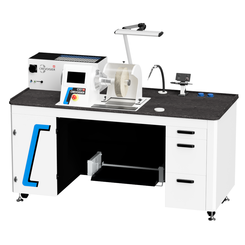 Découvrez la C551, une machine de polissage haut de gamme alliant performance exceptionnelle et design élégant. Dotée d’une interface conviviale à écran tactile, elle offre une expérience utilisateur intuitive. Son moteur broche intégré de 2.1 kW garantit des résultats de polissage impeccables. La polyvalence est à l’honneur avec une compatibilité totale des outillages Crevoisier®, vous permettant d’adapter votre espace de travail selon vos besoins. Sa construction robuste et ses finitions soignées en font un choix idéal pour les professionnels exigeants. Disponible dans des couleurs modernes (Gris RAL 7035, Noir RAL 9011) avec des accents en Bleu RAL 5015, la C551 associe esthétique et fonctionnalité. Optez pour la qualité suisse dans votre atelier de polissage avec la C551.